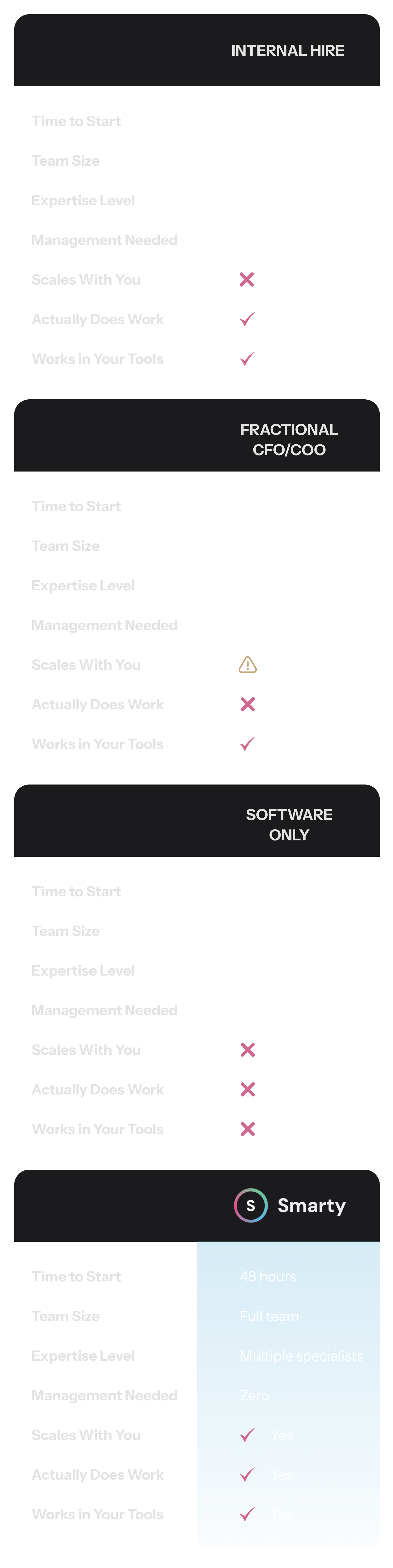 A fractional COO gives you strategic advice a few hours a week. Smarty gives you strategic thinking and execution — a full operator backed by AI and a specialist team who actually does the work. You don't get a deck with recommendations. You get things done.